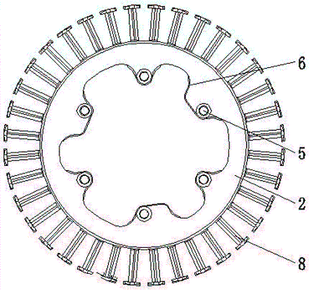 背景技術(shù): 技術(shù)實(shí)現(xiàn)要素: 本技術(shù)的目的在于,提供一種YVP變頻電機(jī)定子骨架。它具有受力強(qiáng)度高、使用壽命長(zhǎng)的特點(diǎn)。本技術(shù)的技術(shù)方案:一種YVP變頻電機(jī)定子骨架,包括上骨架盤和下骨架盤,所述上骨架盤上設(shè)有多個(gè)上定位孔,上定位孔外側(cè)設(shè)有第一加強(qiáng)筋;所述下骨架盤上設(shè)有多個(gè)下定位孔,下定位孔外側(cè)設(shè)有第二加強(qiáng)筋,所述第一加強(qiáng)筋與第二加強(qiáng)筋貼合。 前述的YVP變頻電機(jī)定子骨架中,所述上骨架盤外側(cè)設(shè)有多個(gè)上支架,上支架上設(shè)有矩形槽,所述下骨架盤外側(cè)設(shè)有多個(gè)下支架,下支架上設(shè)有矩形臺(tái)階,所述下支架經(jīng)矩形臺(tái)階扣入上支架的矩形槽內(nèi)。 與現(xiàn)有技術(shù)相比,它通過設(shè)置在定位孔外側(cè)的第一加強(qiáng)筋和第二加強(qiáng)筋,加強(qiáng)了定子骨架在安裝孔與上、下定位孔處的受力強(qiáng)度,提高了定子骨架的使用壽命;并通過設(shè)置在上、下支架上的矩形槽與矩形臺(tái)階的配合安裝,使定子骨架能夠緊密連接,不會(huì)因外力出現(xiàn)松動(dòng)或脫開的現(xiàn)象。本技術(shù)還設(shè)有繞線柱和高低不同的連接板,使漆包線在繞線時(shí)可以互相交錯(cuò)放置,避免漆包線因相互擦碰導(dǎo)致短路或斷開;第三加強(qiáng)筋可以提高上、下支架的連接強(qiáng)度,進(jìn)一步提高了定子骨架的使用壽命。 附圖說明 附圖中的標(biāo)記為:1-上骨架盤,2-下骨架盤,3-上定位孔,4-第一加強(qiáng)筋,5-下定位孔,6-第二加強(qiáng)筋,7-上支架,8-下支架,9-長(zhǎng)槽,10-第三加強(qiáng)筋,11-繞線柱,12-連接板,13-安裝柱,14-接插柱,15-安裝孔,71-矩形槽,81-矩形臺(tái)階。 具體實(shí)施方式 下面結(jié)合附圖和實(shí)施例對(duì)本技術(shù)作進(jìn)一步的說明,但并不作為對(duì)本技術(shù)限制的依據(jù)。實(shí)施例。YVP變頻電機(jī)定子骨架,構(gòu)成如圖1所示,包括上骨架盤1和下骨架盤2,所述上骨架盤1上設(shè)有多個(gè)上定位孔3,上定位孔3外側(cè)設(shè)有第一加強(qiáng)筋4;所述下骨架盤2上設(shè)有多個(gè)下定位孔5,下定位孔5外側(cè)設(shè)有第二加強(qiáng)筋6,所述第一加強(qiáng)筋4與第二加強(qiáng)筋6貼合。 本技術(shù)將下支架8經(jīng)矩形臺(tái)階81扣入上支架7的矩形槽71內(nèi),使上骨架盤1與下骨架盤2緊密連接,上定位孔3與下定位孔5經(jīng)骨架盤連接后可置入定位銷,定位銷可以提高定子骨架的受力強(qiáng)度并起到限位作用,防止定子骨架在工作時(shí)因外力出現(xiàn)松散或脫開的現(xiàn)象,定位孔外側(cè)的第一加強(qiáng)筋4和第二加強(qiáng)筋6可以提高定子骨架在定位孔與安裝孔處的受力強(qiáng)度,防止定子骨架因外力出現(xiàn)變形或斷裂的現(xiàn)象。上、下骨架盤連接后漆包線可經(jīng)繞線柱11與連接板12進(jìn)入上、下支架形成繞組線圈,不同高度的連接板12可以使漆包線在繞線時(shí)高低交錯(cuò)放置,防止漆包線在電機(jī)工作時(shí)因外力相互擦碰導(dǎo)致短路或斷開。上、下支架內(nèi)側(cè)用于放置定子鐵芯,外側(cè)用于放置繞組線圈,長(zhǎng)槽9用于緩解加工中的塑料收縮問題,第三加強(qiáng)筋10用于提高上、下支架的連接強(qiáng)度;上骨架盤1一端的安裝柱13和接插柱14用于連接變頻電機(jī)測(cè)速器,通過變頻電機(jī)測(cè)速器可以實(shí)時(shí)檢測(cè)變頻電機(jī)的工作狀態(tài),保證電機(jī)的平穩(wěn)運(yùn)行。 技術(shù)特征: 1.變頻電機(jī)定子骨架,其特征在于:包括上骨架盤(1)和下骨架盤(2),所述上骨架盤(1)上設(shè)有多個(gè)上定位孔(3),上定位孔(3)外側(cè)設(shè)有第一加強(qiáng)筋(4);所述下骨架盤(2)上設(shè)有多個(gè)下定位孔(5),下定位孔(5)外側(cè)設(shè)有第二加強(qiáng)筋(6),所述第一加強(qiáng)筋(4)與第二加強(qiáng)筋(6)貼合。 2.根據(jù)權(quán)利要求1所述的變頻電機(jī)定子骨架,其特征在于:所述上骨架盤(1)外側(cè)設(shè)有多個(gè)上支架(7),上支架(7)上設(shè)有矩形槽(71),所述下骨架盤(2)外側(cè)設(shè)有多個(gè)下支架(8),下支架上設(shè)有矩形臺(tái)階(81),所述下支架(8)經(jīng)矩形臺(tái)階(81)扣入上支架(7)的矩形槽(71)內(nèi)。 3.根據(jù)權(quán)利要求2所述的變頻電機(jī)定子骨架,其特征在于:所述上支架(7)與下支架(8)上均設(shè)有長(zhǎng)槽(9),長(zhǎng)槽(9)一端設(shè)有第三加強(qiáng)筋(10)。 4.根據(jù)權(quán)利要求1所述的變頻電機(jī)定子骨架,其特征在于:所述上骨架盤(1)上設(shè)有多個(gè)繞線柱(11),相鄰繞線柱(11)之間設(shè)有連接板(12)。 5.根據(jù)權(quán)利要求4所述的變頻電機(jī)定子骨架,其特征在于:所述連接板(12)包括多組連接板組,每組連接板組包括三塊由低到高依次設(shè)置的連接板單體,連接板單體設(shè)置在相鄰繞線柱(11)之間。 6.根據(jù)權(quán)利要求1所述的變頻電機(jī)定子骨架,其特征在于:所述上骨架盤(1)一端設(shè)有安裝柱(13)和接插柱(14)。 7.根據(jù)權(quán)利要求1所述的變頻電機(jī)定子骨架,其特征在于:所述上骨架盤(1)上設(shè)有安裝孔(15),安裝孔(15)以間隔分布的方式設(shè)置在上定位孔(3)一側(cè)。 技術(shù)總結(jié)